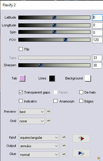 Adjust / Sharpness Sharpen Effects / Plugins / Flaming Pear / Flexify 2 0 0 0 120 33 30 equirectanglar annulus