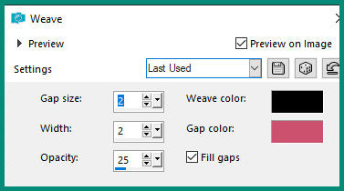 Adicione nova layer Pinte com a cor branca Layers / New mask layer / From image / Mask [Narah-Mask-1141a] Merge group Effects / Texture Effects / Weave - cor #000000 e #cb516f