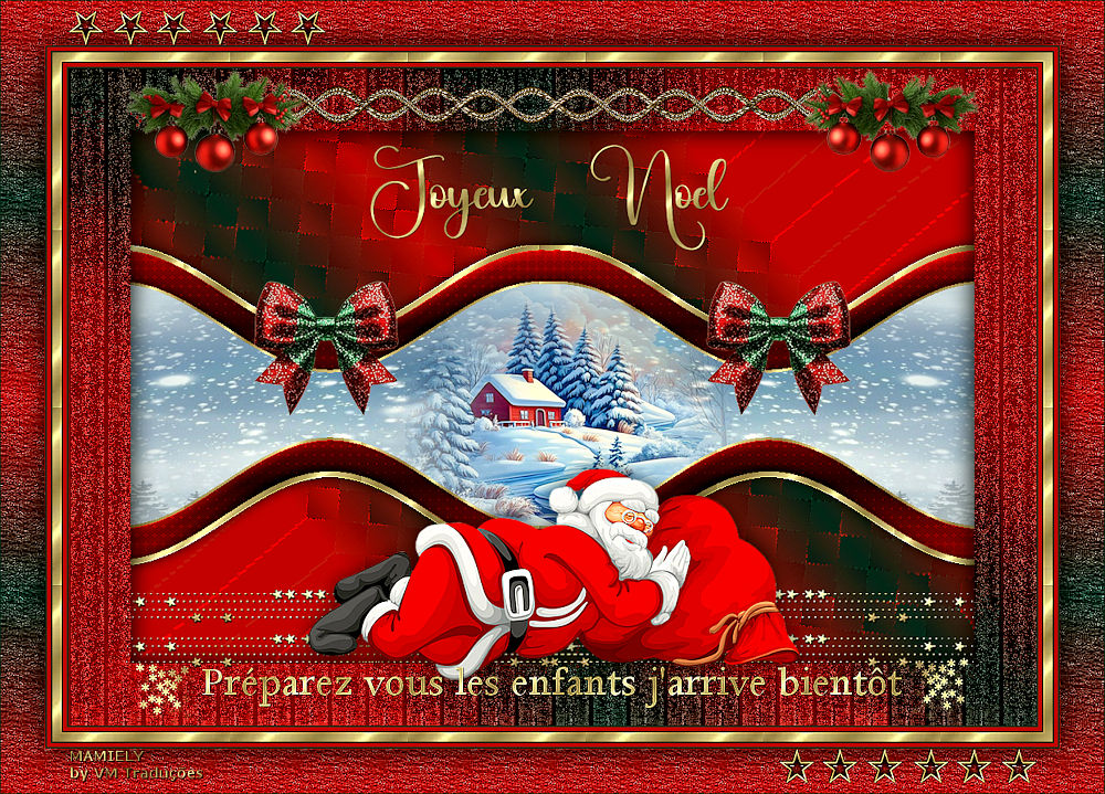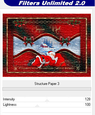 11 Copie o tube [Noeud de Noel] Cole como nova layer Posicione conforme modelo Layers / Duplicate Image / Mirror / Mirror Horizontal 12 Merge down Copie o tube [Boules de Noel] Cole como nova layer Objects / Align / Top Copie o tube [Texte Joyeux Noel] 13 Cole como nova layer Posicione conforme modelo Copie o tube [Pere noel-ML] Cole como nova layer Posicione conforme modelo 14 Drop shadow de sua escolha Copie o texto [Texte Préparez vous les enfants] Cole como nova layer Posicione conforme modelo Merge all 15 Bordas: 2px / cor 1 4px / cor 2 2px / cor 1 Selections / Select all Borda: 10px/branco Selections / Invert Pinte a seleção com a pattern [Or] 16 Adjust / Sharpness / Sharpen - 2 vezes Select none Bordas: 2px / cor 1 4px / cor 2 2px / cor 1 Selections / Select all Borda: 50px / branco 17 Selections / Invert Pinte com o gradiente Effects / plugins / Unlimited 2 / Paper Texture / Structure Paper 3