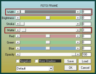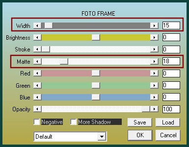 6 Selections / Select all Selections / Float - selections / Defloat Selections / Modify / Contract: 1 Selections / Invert Presione Delete Selections / Invert 7 Effects / Plugins / AAA Frames / Foto Frame