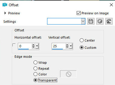 34. Pressione Delete no teclado 35. Select none STEP 8 36. Copie o tube [Glitter Star Tree] e cole como nova layer 37. Effects / Image Effects / Offset [0/25]