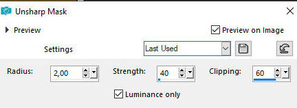 Estampe no canto direito superior quantas vezes quiser, usando a cor do foreground Observação: O brush fornecido não funcionou na minha versão do psp, então, optei por não aplicar Adjust - Sharpness - Unsharp Mask