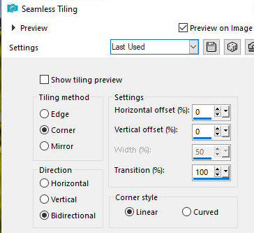 8. Adicione uma nova layer 9. Selections / Select all 10. Copie a imagem [plaatjeless329] e cole na seleção 11. Select none(caso queira, pode colorizar de acordo com suas cores) 12. Effects / Image Effects / Seamless Tiling - igual ao anterior
