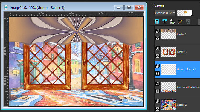 Posicione a layer da mask abaixo da layer da janela Layers / Properties / Blend Mode: Luminance ( ou outro de sua escolha) / Opacity:70% Layers / Duplicate