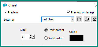 Copie o seu tube principal Cole como nova layer Ajuste o tamanho Posicione conforme modelo Drop Shadow de sua escolha Copie o seu tube decorativo Cole como nova layer Ajuste o tamanho Drop Shadow de sua escolha Selections / Load selection from alpha channel / Selection 3 Adicione nova layer Pinte a seleção com uma cor de sua escolha Effects / 3D Effects / Chisel