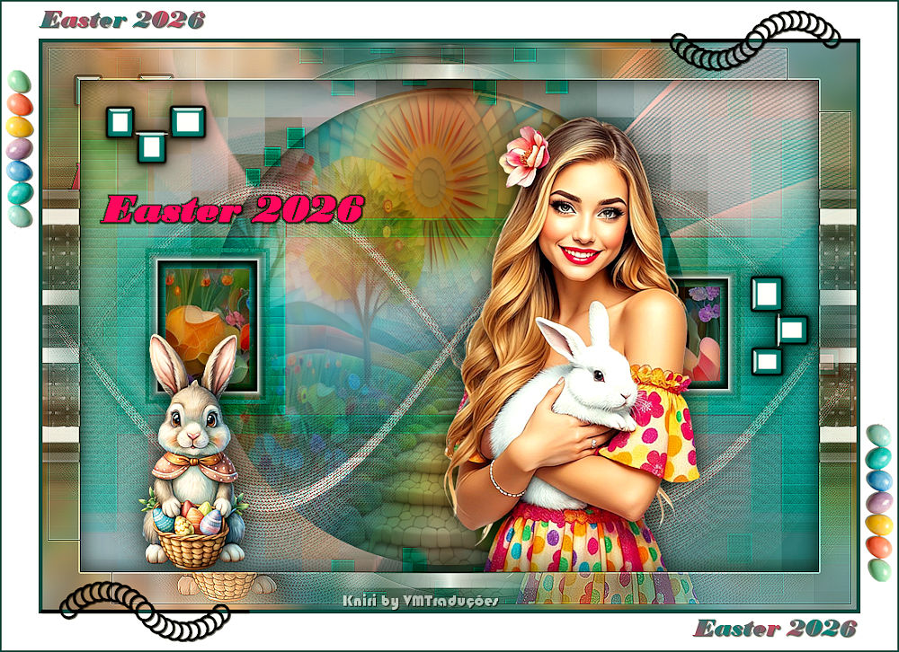 Imagens ligadas ao tema páscoa: 1 tube principal Tubes decorativos e imagens * Abra o alpha channel [alphakniri] / Duplique (shift+d) / Feche o original Selections / Select all Copie a imagem [bgchannel] Cole na seleção Select none Layers / Duplicate Effects / Image Effects / Seamless Tiling - default Effects / Plugins / unlimited 2 / Tile & Mirror / Radial Mirror [110/110] Selections / Load selection from alpha channel / Selection 1 Pressione Delete Adicione nova layer Copie a imagem [KamilTube- 5880-BG] Cole na seleção Blend mode: Overlay / opacity: 55% Effects / Plugins / Eye Candy 5: impact - Glass - preset [clear] Layers / Arrange / Move Down Ative a layer superior Selections / Invert Effects / Distortion Effects / Pixelate