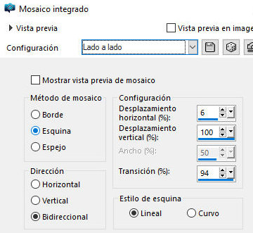 Copia tu tubo principal y pégalo en la selección. No seleccionar ninguno Efectos - Efectos de imagen - mosaico integrado - preestablecido [lado a lado]