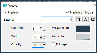 10. Image / Resize: 90% - all layers desmarcado 11. Ative a layer inferior 12. Effects / Texture Effects / Weave - cores: 1 e 2