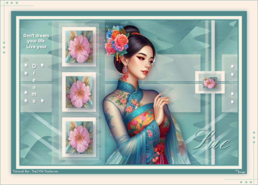 48. Layers / Properties / Blend Mode: Overlay 49. Ative a layer superior 50. Drops shadow de sua escolha 51. Merge all 52. Image / Add borders / Symmetric marcado 3px /cor do background 3px / cor do foreground 10px / branco 2px / cor do foreground 20px / cor do background 53. Selections / Select all 54. Image / Add borders / 45px branco 55. Drop Shadow: 0 0 60 25 cor do background 56. Select none 57. Copie o tube [deco-4-Ri@] e cole como nov alayer 58. Não mova 59. Image / Add borders / 1px / cor do background 60. Coloque as assinaturas 61. Merge all 62. Image / Resize: 900px(width) (opcional) 63. Salve com jpeg * Muito obrigado por testar minhas traduções, Irene