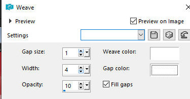 31. Adicione uma nova layer 32. Copie o tube [deco-2-Ri@] e cole na seleção 33. Effects / Texture Effects / Weave