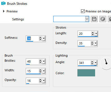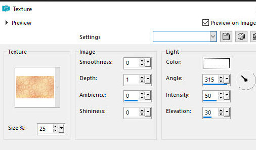 39. Select none 40. Minimize essa imagem 41. Abra uma nova imagem transparente medindo 300x150px 42. Pinte com a cor do background 43. Effects / Texture Effects / Texture [misc90]