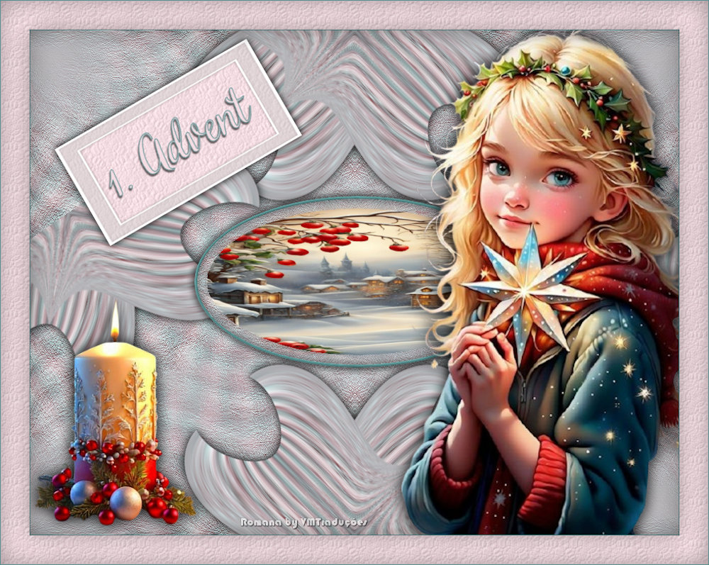 45. Drop Shadow: 0 0 40 5 preto 46. Ative a Text Tool / Escolha uma fonte / Configuração de sua escolha(size, cor...) /Digite o texto "1.Advent" ou outro de sua escolha 47. Drop Shadow: 2 -2 60 2 preto 48. Merge visible 49. Copie esta imagem 50. Ative sua imagem principal 50b. Cole a imagem copiada como nova layer 51. Image / Free Rotate [left/30]
