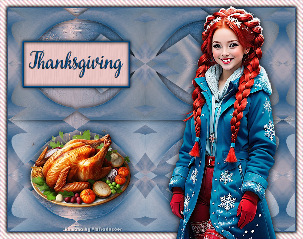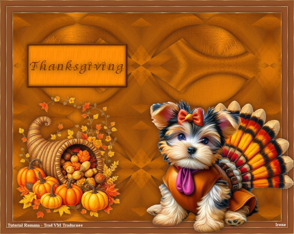 Etapa 5 Ative a Text Tool Escreva "Thanksgiving" / Use uma fonte e configuração e de sua escolha Clique com o botão direito na layer e selecione Converter em Raster layer Posicione no quadro pequeno conforme o modelo Drop shadow: 2 -2 100 30 preto Copie o tube decorativo e cole como nova layer Ajuste o tamanho e posicione à esquerda conforme modelo Drop Shadow: 0 0 100 30 preto Image / Add borders / 1px / #68204c Selections / Select all
