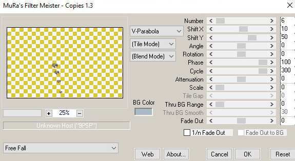 53. Drop shadow: 0 0 85 35 preto 54. Layers / Duplicate 55. Image / Resize: 25% - all layers desmarcado 56. Effects / Plugin / Mura's meister / Copies