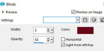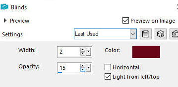 Blend mode: multiply Layers / Arrange / Move down 29. Bordas: 2px / cor do background 2px / branco 1px / cor do background 2px / branco 2px / cor do background 30. Selections / Select all borda: 45px / branco Selections / Promote selection to layer 31. Select none Drop Shadow: 0 0 80 15,00 preto 32. Ative a layer inferior - background Selections / Selet all Maximize a imagem reservada anteriormente Copie e cole na seleção Select none 33. Effects / Texture Effects / Blinds - igual anterior porém mude a opacidade para 15 ==blinds