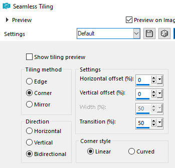 1. Abra seu material no psp Escolha uma cor clara para o foreground e uma cor escura para o background 2. Abra uma nova imagem transparente com 900x55opx Pinte com uma de suas cores A autora usou a cor escura 3. Selections / Select all Adicione nova layer Copie o seu tube principal e cole na seleção Select none 4. Effects / Image Effects / Seamless Tiling - default ==default