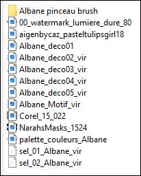 ROTEIRO > Abra as masks no psp e minimize >Ajuste o tamanho dos tubes de acordo com suas imagens * >>Salve os dois arquivos que estão na pasta [Albane pinceau brush] na pasta Brushes do PSP para que eles funcionem quando for usar (se salvar somente um, não irá funcionar e você terá que exportar) >>Salve o arquivo [Albane_Motif_vir] na pasta Patterns do psp ou minimize na área de trabalho quando for usar >>Salve a textura [Corel_15_022] na pasta Textures do PSP >>Salve as seleções [Albane 1 e 2] na pasta Selections do psp
