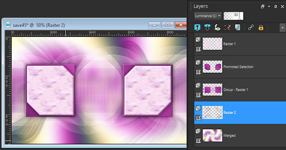 44. Select none 45. Ative a layer de fundo - merged 46. Copie o tube [Albane-deco01] e cole como nova layer 47. Layers - Properties - Blend Mode: Luminance (L) - Opacity=80 48. A imagem e as layers estarão assim: