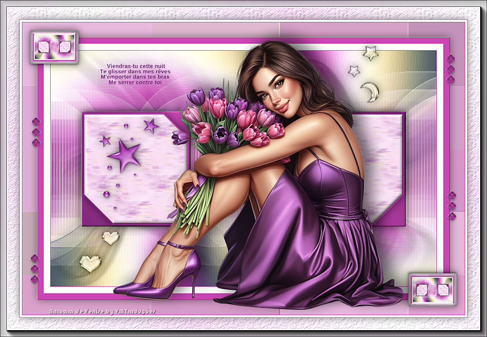 63. Adjust - Sharpness - Sharpen 64. Mantenha a seleção 65. Selections - Invert 66. Drop shadow: 0 0 50 30 preto 67. Select none 68. Image - Add borders - 1px - #ca46b2 69. Image - Add bordes - 5px - branco 70. Image - Add borders - 1px - #601d64 71. Coloque a cor #f8d9f5 no background - foreground=branco 72. Prepare um gradiente Linear