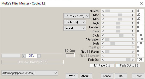 Select none Merge down Image - Resize: 35% all layers desmarcado Adjust - Sharpness - Sharpen 7 Effects - Plugins - Mura's meister - Copies