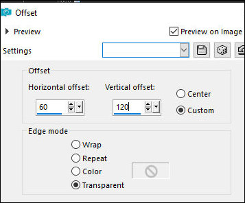 Select none Copie o tube[ngfind.com-estrellas-blancas-png-5372889] e cole como nova layer Image - Mirror - Mirror horizontal Objects - Align - Bottom Layers - Properties - Blend Mode: Overlay Copie o tube [LF-ChristmasDeco-4] e cole como nova layer Image - Mirror - Mirror Horizontal Effects - image Effects - Offset [60/120] Observação: se usar outro tube, cuide para que o nó que aparece no centro da imagem, fique oculto